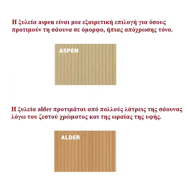 Aspen wood is an excellent choice for those who prefer the sauna in a beautiful, soft tone. Alder wood is preferred by many sauna lovers due to its warm color and beautiful texture.