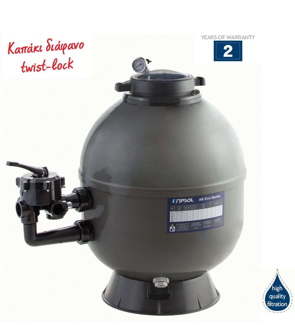 Το φίλτρο άμμου Artik Evo της Kripsol διαθέτει διάφανο καπάκι twist-lock για άμεση πρόσβαση.